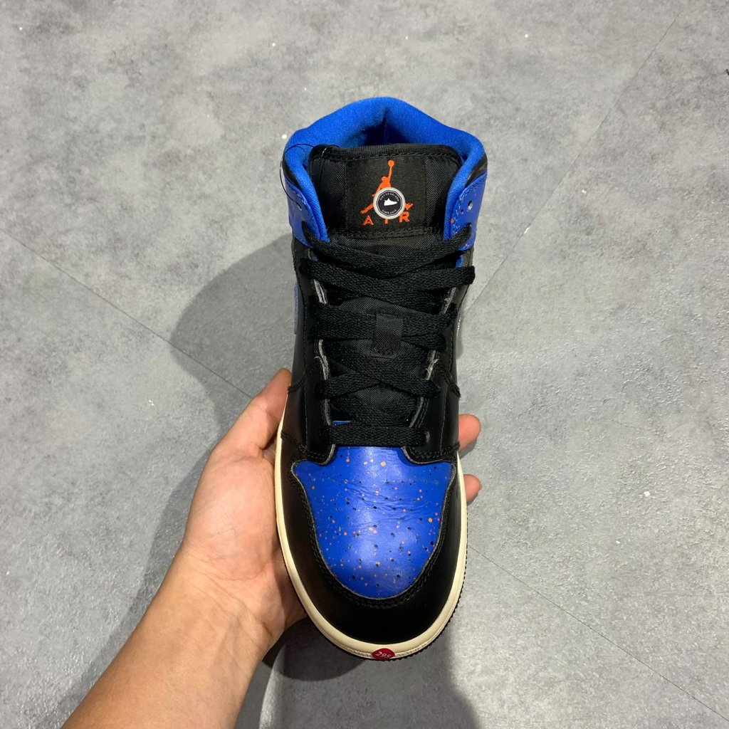 📝 Mô tả chi tiết sản phẩm: Air Jordan 1 Mid GS "Paint Splatter" sở hữu thiết kế cổ lỡ năng động, với thân giày bằng da tổng hợp cao cấp pha trộn giữa các mảng màu Đen, Xanh Signal và Cam Team. Điểm nhấn độc đáo là họa tiết vệt sơn màu cam nổi bật trên phần mũi giày đục lỗ, gót giày, cổ giày và logo Swoosh. Đế giữa màu trắng tích hợp công nghệ Air mang lại sự êm ái, kết hợp cùng đế ngoài màu đen với hoa văn đồng tâm tăng cường độ bám. Nhấn giày hãng 2hand chính hãng đã qua sử dụng tại Giày Cũ Sài Gòn.