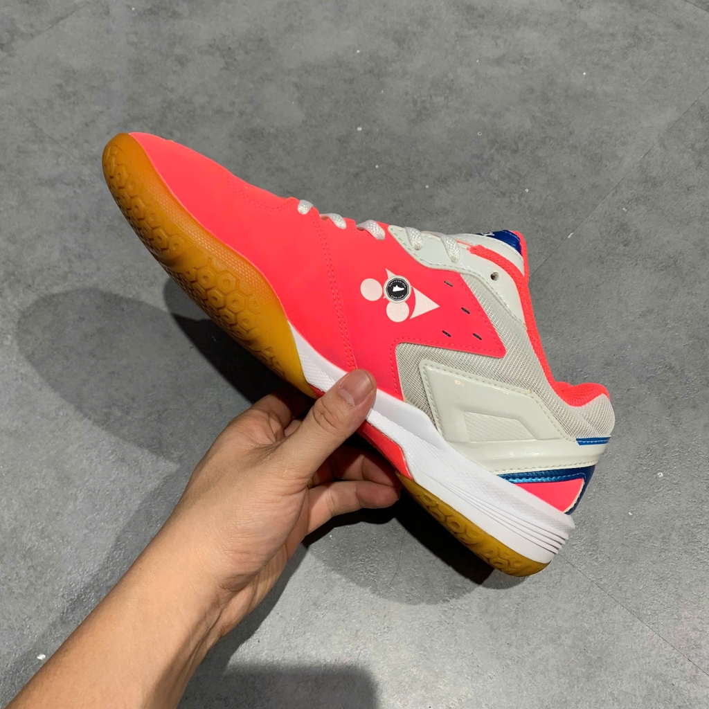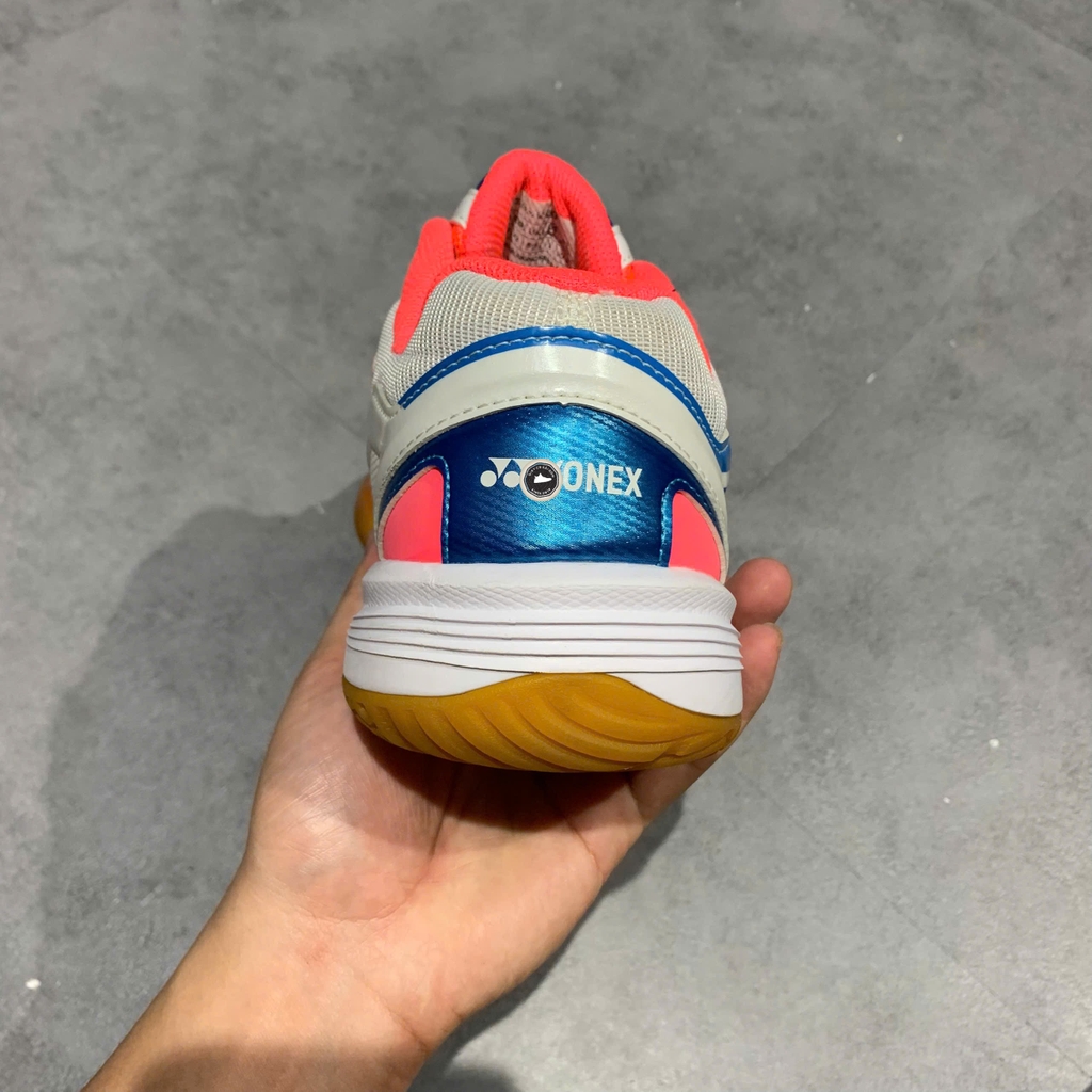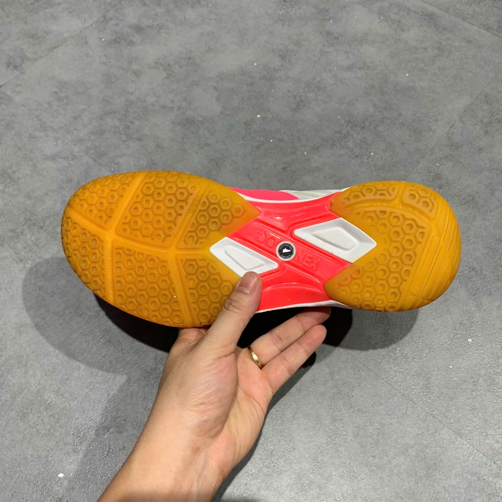 Mẫu giày sở hữu công nghệ độc quyền **Power Cushion** của Yonex, giúp hấp thụ chấn động cực tốt và chuyển hóa năng lượng đó thành sức bật cho các bước di chuyển tiếp theo. Phần upper được làm từ da P.U kết hợp lưới Double Russel Mesh siêu thoáng khí, giúp đôi chân luôn khô thoáng trong suốt trận đấu. Đế giày **Hexagrip** với các rãnh hình lục giác cung cấp độ bám sân vượt trội, hỗ trợ những pha di chuyển đa hướng linh hoạt và ổn định. Phối màu Hồng Trắng mang lại vẻ ngoài trẻ trung, năng động và đầy cá tính trên sân đấu.