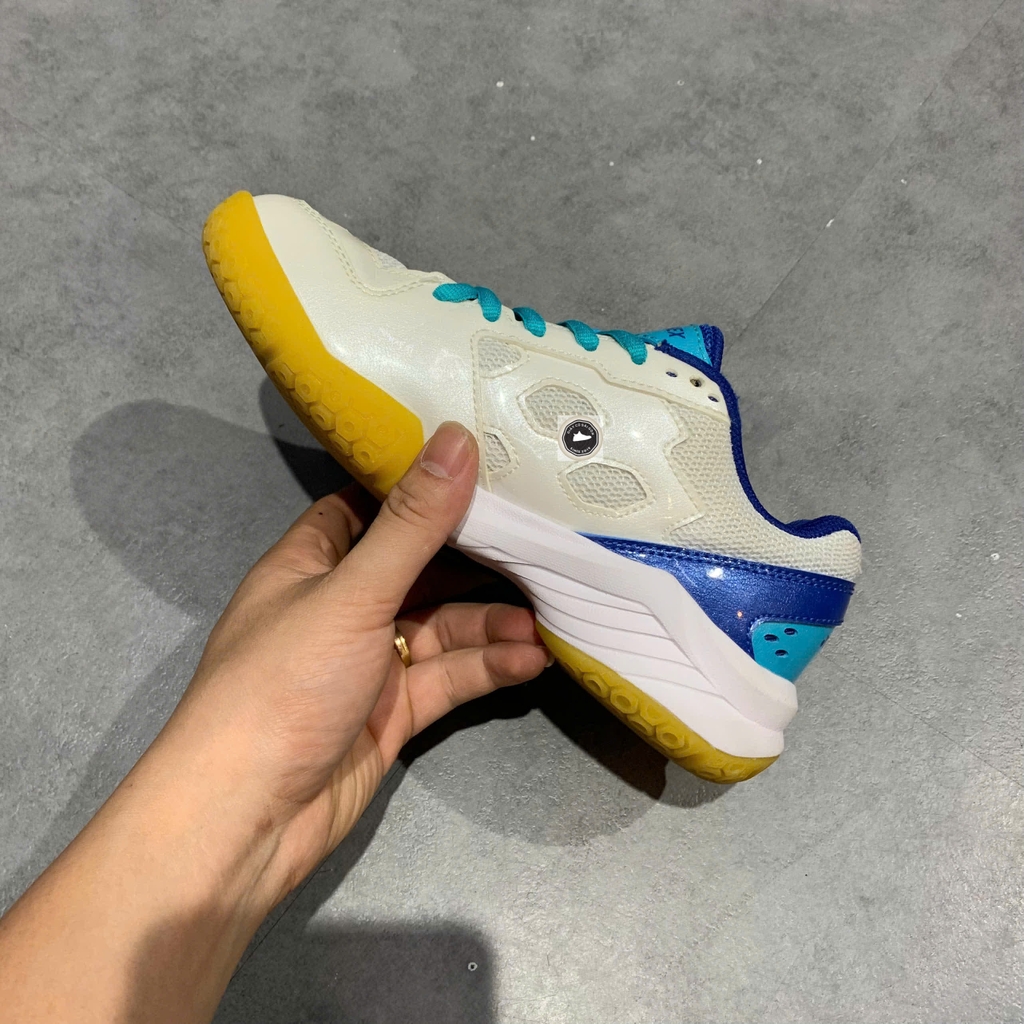 – Upper kết hợp PU Leather + mesh thoáng khí, hỗ trợ ổn định và giảm độ ẩm khi chơi trong thời gian dài. Đế ngoài bằng cao su chống trượt Non-Marking Rubber bảo vệ sàn và tăng độ bám khi thay đổi hướng di chuyển.