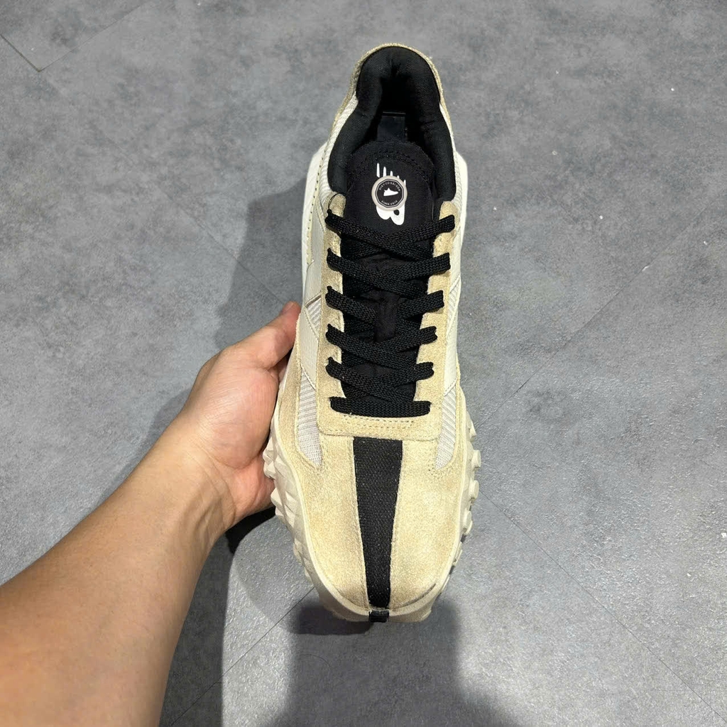 Đôi giày thuộc dòng XC-72 của New Balance, phối màu Moonbeam / Black, kết hợp upper bằng lưới thoáng (mesh) và da lộn/suede overlay để tăng độ hỗ trợ và nét thẩm mỹ. Phần đế ngoài sử dụng các họa tiết đa dạng để tăng độ ma sát và bám đường khi di chuyển.