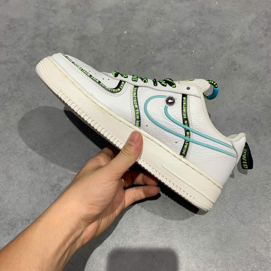 📝 Mô tả chi tiết sản phẩm: Giày có thiết kế cổ điển Air Force 1 Low với upper bằng da cao cấp màu trắng tinh tế. Điểm nhấn là các chi tiết đồ họa "Nike Worldwide" nổi bật trên dây giày, lưỡi gà và tab gót, cùng dấu Swoosh màu Blue Fury và các điểm nhấn màu Volt sống động. Đế giữa bằng foam tích hợp công nghệ Nike Air mang lại sự êm ái, cùng đế ngoài cao su bền bỉ. Phiên bản này được phát hành vào khoảng tháng 7 năm 2020, mang tinh thần toàn cầu hòa nhập. Nhấn giày hãng 2hand chính hãng đã qua sử dụng tại Giày Cũ Sài Gòn.