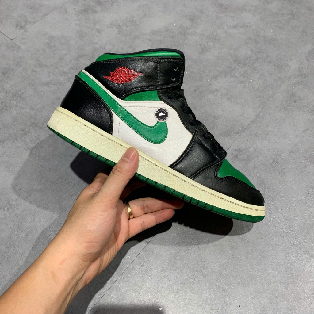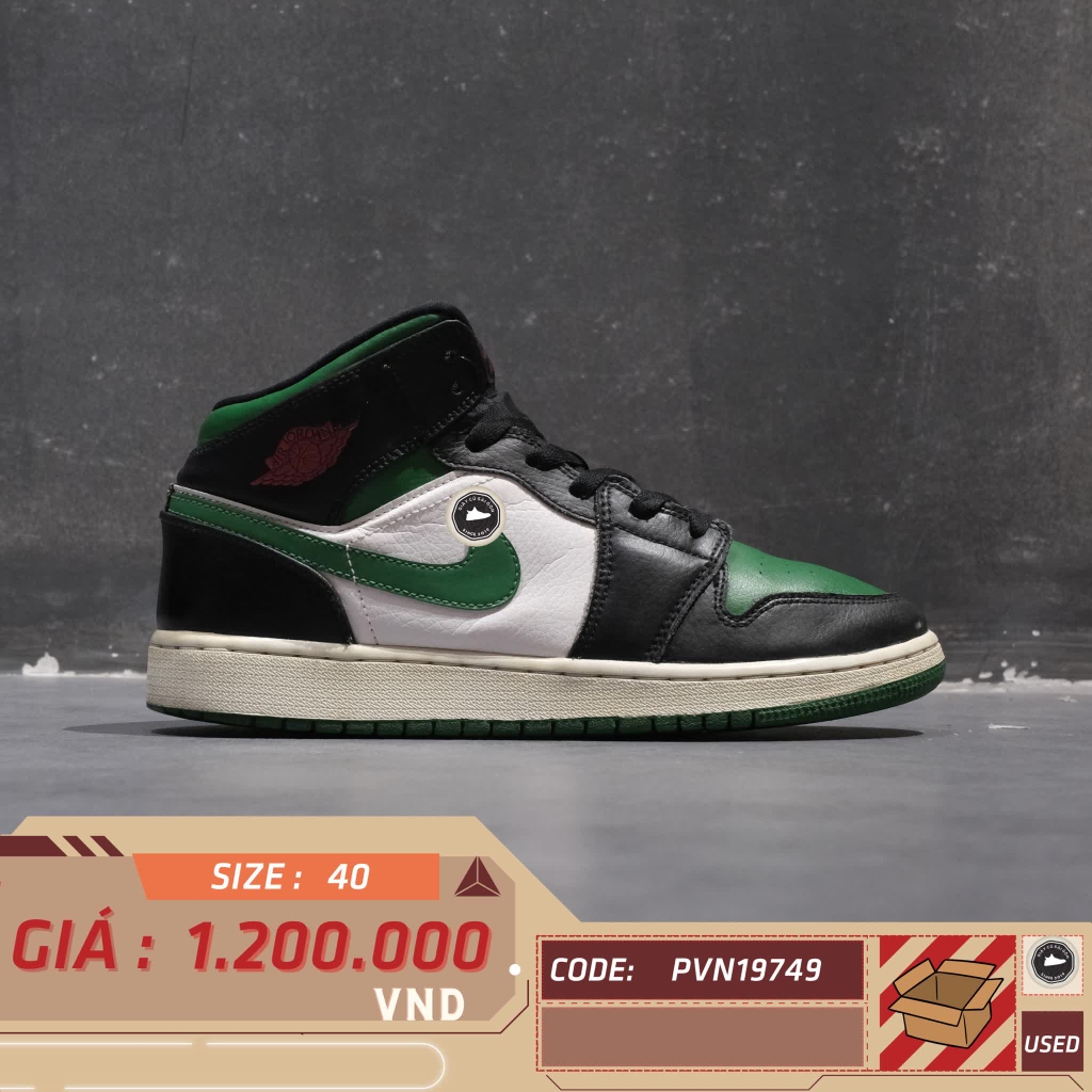 Phiên bản Air Jordan 1 Mid “Black Pine Green” (mã 554725-067) gây ấn tượng với phối màu chủ đạo đen và trắng, điểm nhấn xanh Pine Green ở phần mũi (toe), cổ giày và logo Swoosh – cùng biểu tượng Wings màu đỏ nổi bật trên cổ giày . Thiết kế mid-cut form cổ điển, chất liệu da cao cấp và phối màu hài hoà, toát lên vẻ thời thượng nhưng vẫn dễ phối đồ. Giày 2hand chính hãng đã qua sử dụng tại Giày Cũ Sài Gòn – giữ nguyên phong cách và chất lượng đặc trưng.