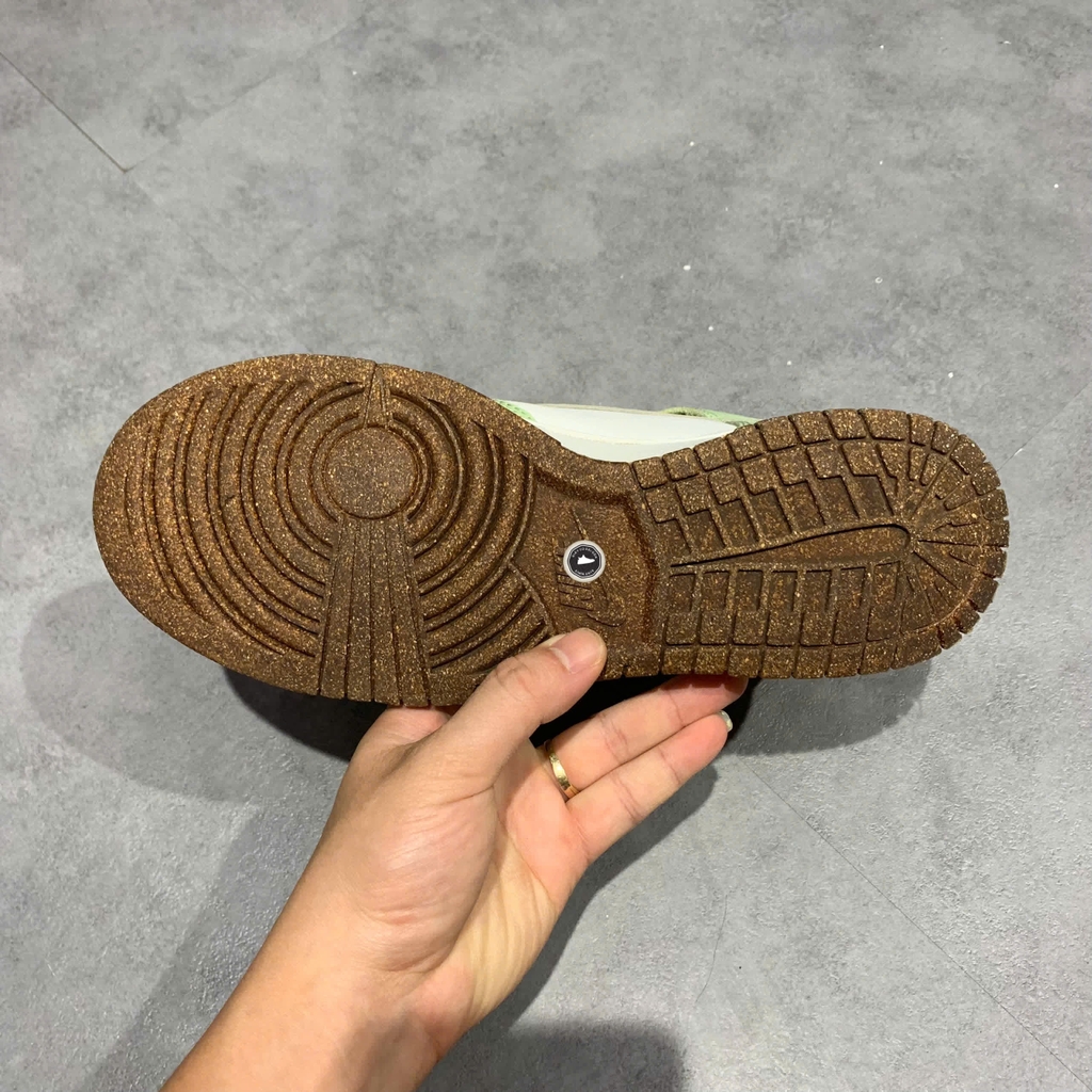 Thiết kế: High-top thuộc dòng Dunk SE “Inspected by Swoosh”, upper da trắng Summit White kết hợp overlays và swoosh màu xanh Honeydew pastel. Có chi tiết stitching contrast quanh Swoosh và lưỡi giày dạng raw-cut. Đế giữa trắng, phần outsole làm từ cao su pha cork nhẹ có màu nâu đất ấm.
