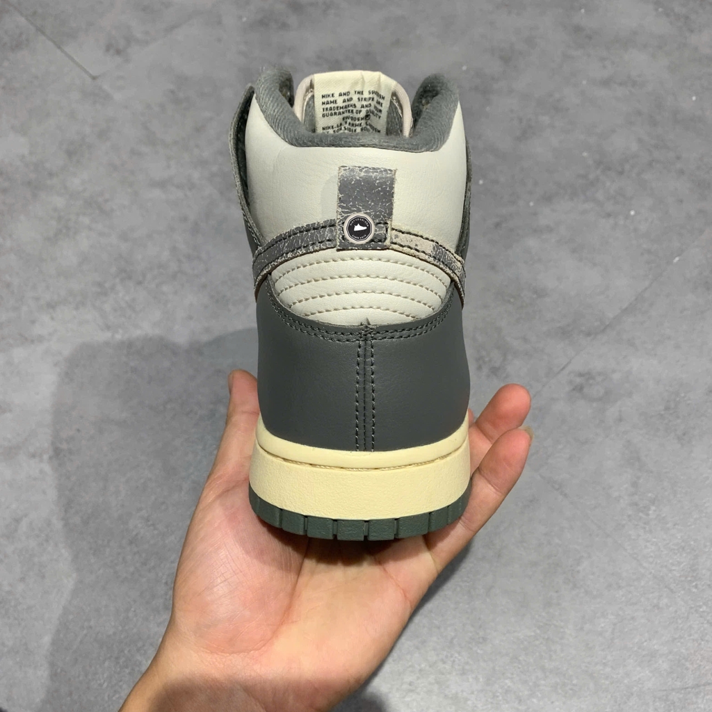 📝 Mô tả chi tiết sản phẩm: Nike Dunk High Vintage Light Bone Grey là một phiên bản retro cổ cao, mang phối màu Light Bone/Tumbled Grey-Coconut Milk-Alpha Orange đầy phong cách. Thân giày được làm hoàn toàn bằng da màu xám nhạt, kết hợp các lớp phủ màu xám đậm, dấu Swoosh đặc trưng bằng da có hiệu ứng distressed, dây buộc và đế ngoài có rãnh đồng màu. Giày có hộp mũi đục lỗ và cổ đệm bằng vải tổng hợp. Đặc biệt, phần đế giữa cao su được ngả vàng nhẹ, tạo nên nét vintage độc đáo. Logo thương hiệu màu cam nổi bật trên lưỡi gà và lót giày. Nhấn giày hãng 2hand chính hãng đã qua sử dụng tại Giày Cũ Sài Gòn.