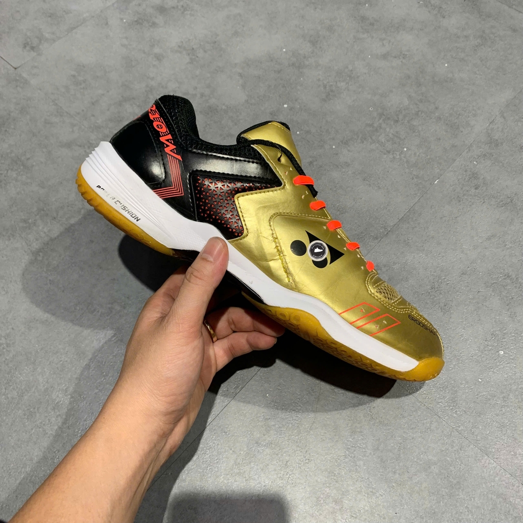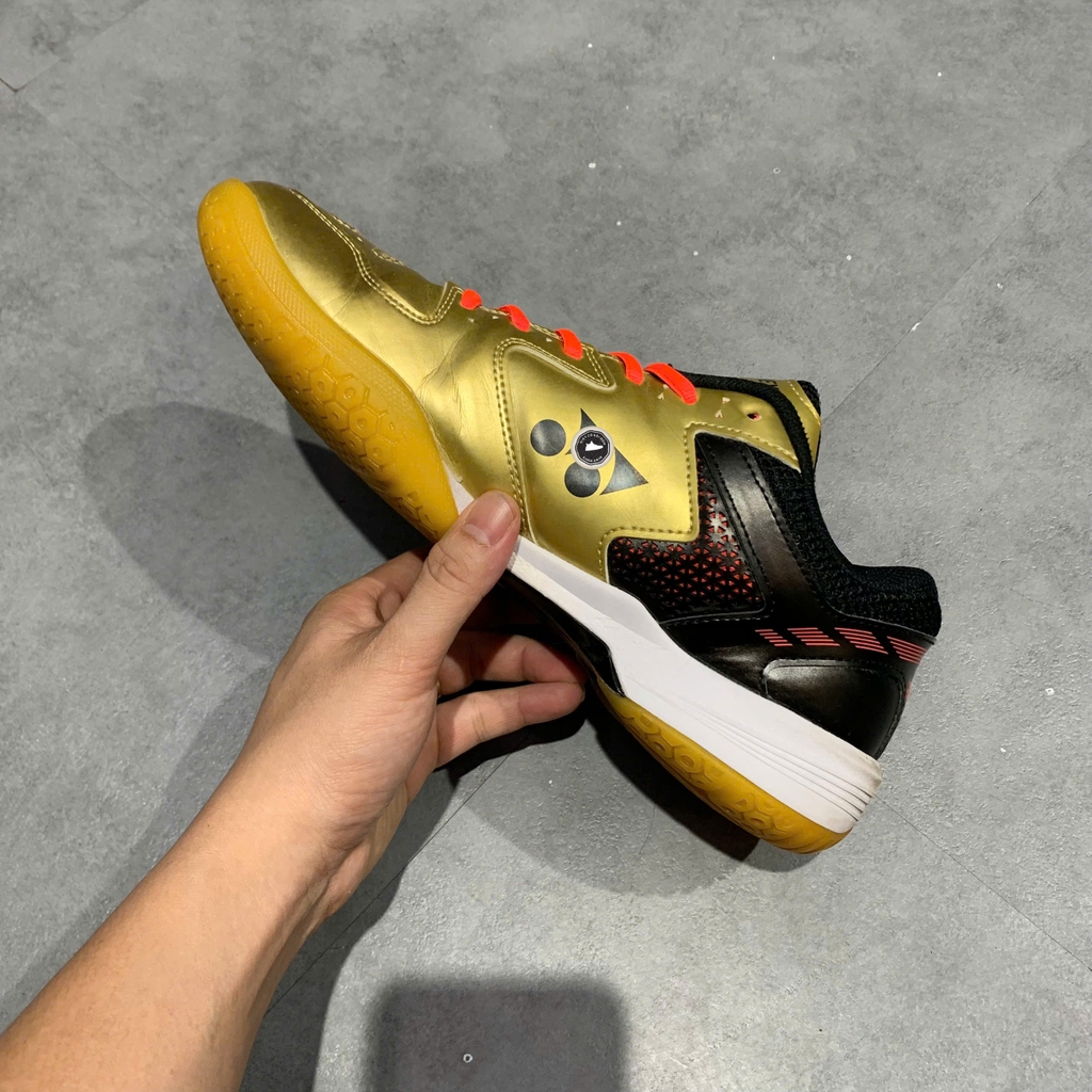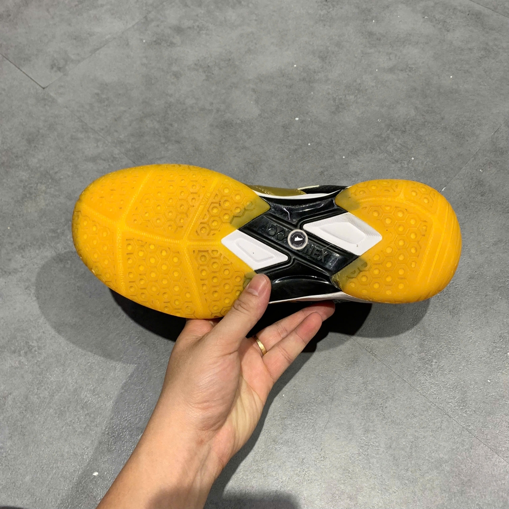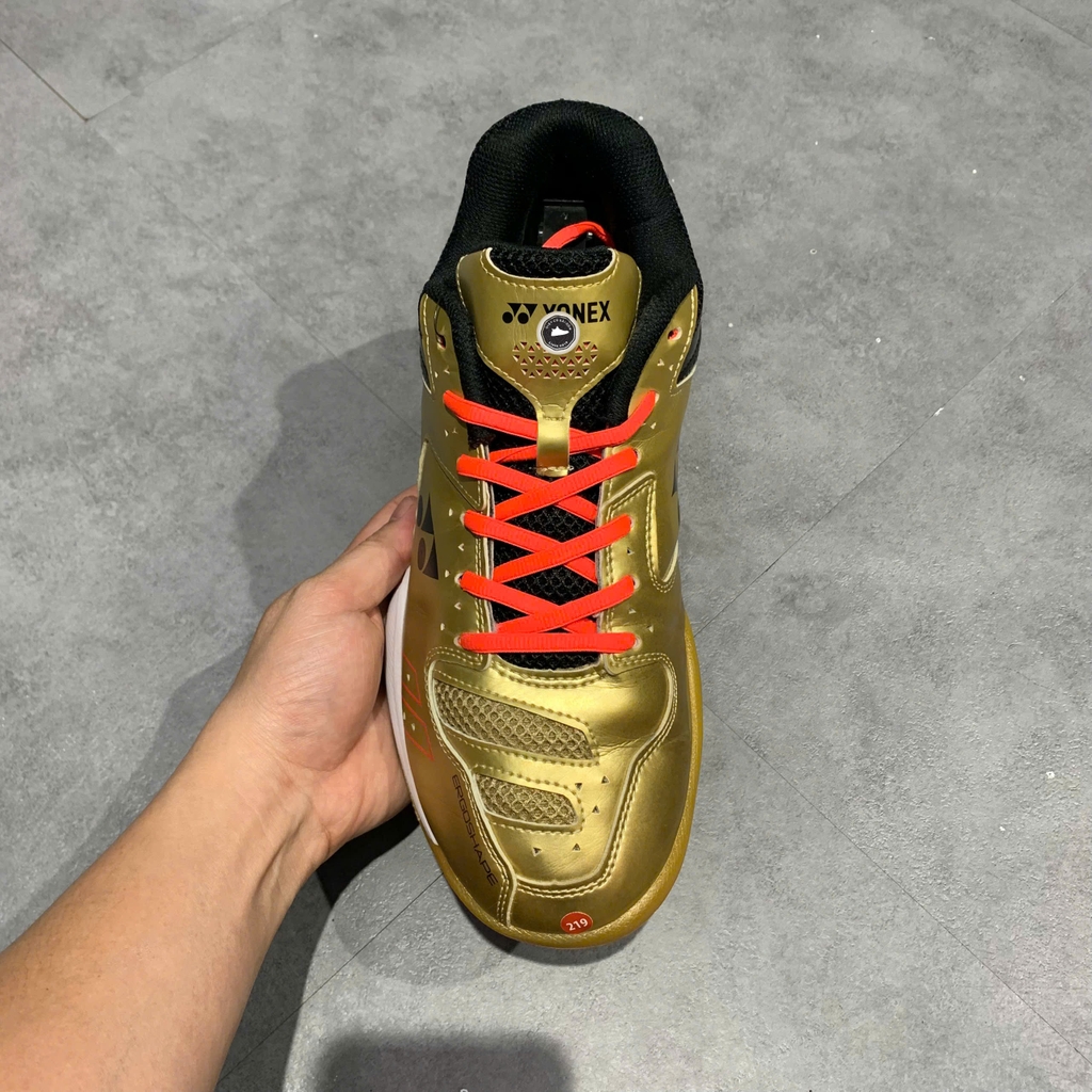 Điểm nổi bật của mẫu giày này chính là công nghệ Power Cushion độc quyền từ Yonex, có khả năng hấp thụ cú sốc cực tốt và chuyển hóa năng lượng đó thành sức bật cho bước di chuyển tiếp theo. Thân giày được chế tác từ sự kết hợp giữa da tổng hợp bền bỉ và lớp lưới mesh thoáng khí, giúp kiểm soát độ ẩm và giữ cho đôi chân luôn khô thoáng. Đế ngoài làm bằng cao su cao cấp với cấu trúc Hexagrip đặc trưng, cung cấp độ bám sân vượt trội và sự ổn định khi thực hiện các pha di chuyển đa hướng nhanh. Phối màu Vàng Đồng (Gold) mang lại vẻ ngoài sang trọng, mạnh mẽ và cực kỳ nổi bật trên sân đấu.